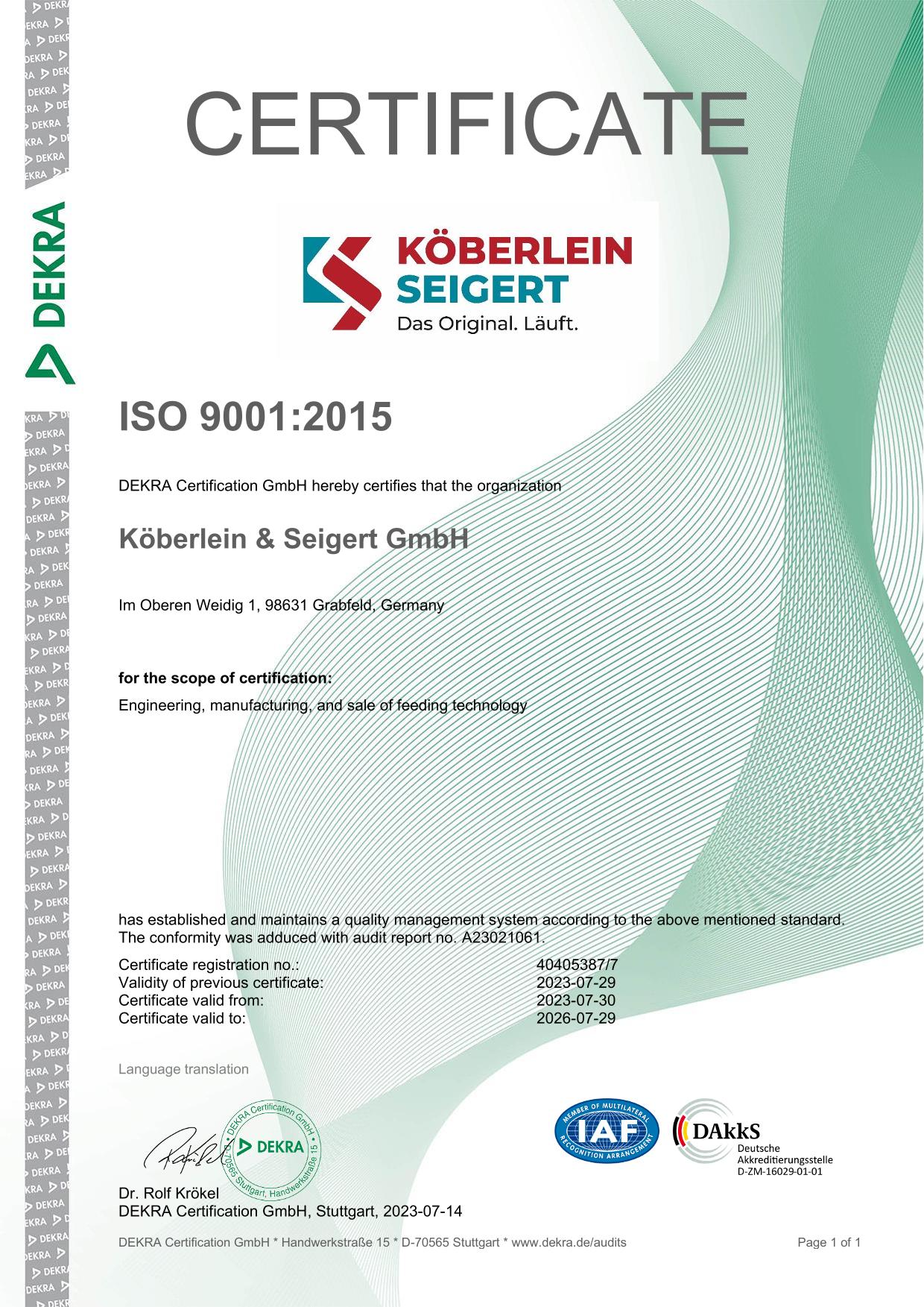 Customer satisfaction is our top priority. To anchor this objective as part of our corporate identity, Köberlein & Seigert introduced a quality management system that has been EN ISO 9001-certified since 1998 and is constantly updated. Our committed staff uses the latest production technology to build plants tailored to your requirements. Precise processing and sturdy design ensure our technology endures. Every one of our machines is thoroughly tested before delivery so that it is ready for immediate use at full capacity.