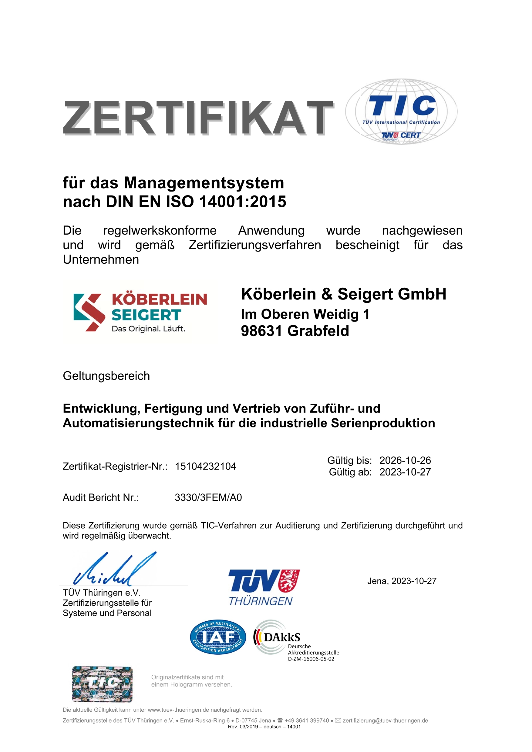 Kundenzufriedenheit ist unser höchstes Ziel. Um dieses Ziel fest in unserer Unternehmensidentität zu verankern, hat Köberlein & Seigert ein Qualitätsmanagementsystem eingeführt, das seit 1998 nach DIN EN ISO 9001 zertifiziert ist und kontinuierlich auf dem neuesten Stand gehalten wird. Mit engagierten Mitarbeitern und neuester Fertigungstechnik bauen wir exakt auf Sie zugeschnittene Anlagen. Die präzise Verarbeitung und stabile Ausführung sichern einen langlebigen Einsatz unserer Technik. Jede unserer Maschinen wird vor Auslieferung auf Herz und Nieren getestet, damit sie bei Ihnen direkt einsatzbereit ist und von Beginn an die volle Leistung bringt.